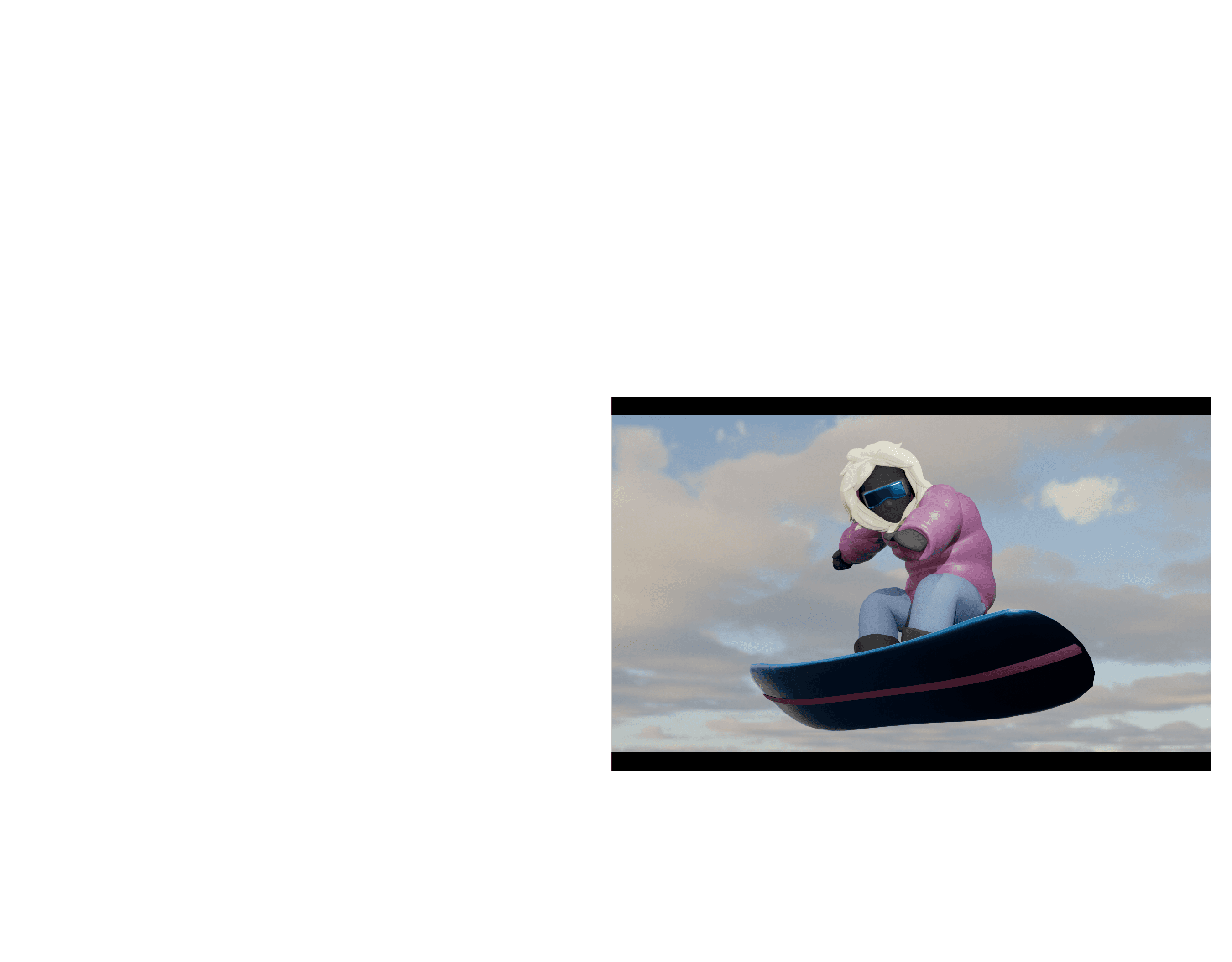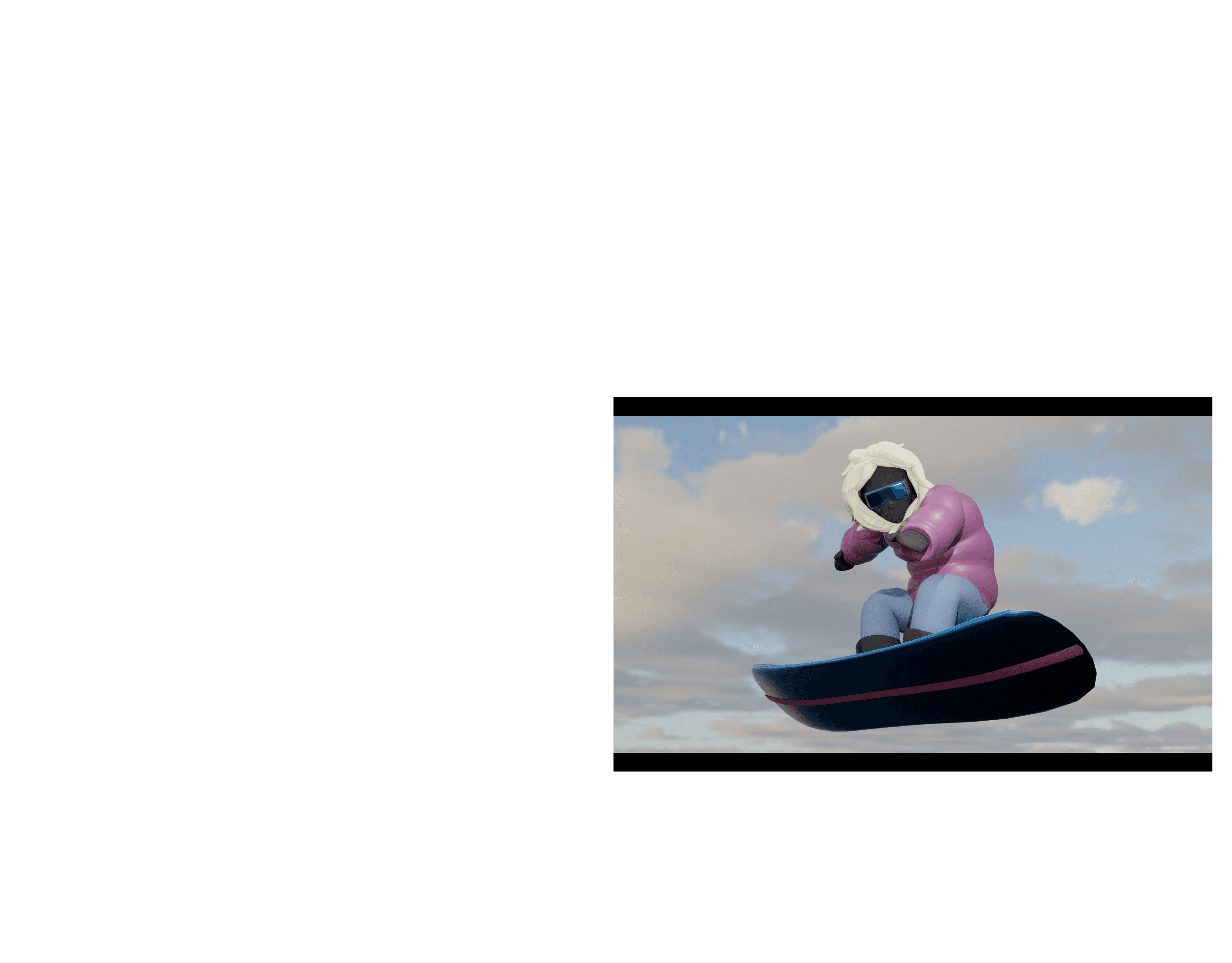 A 3D animation featuring captivating snowboarding visuals with an underlying message warning against the overindulgence in digital media at the expense of wellbeing, responsibility, and connection to the natural world.